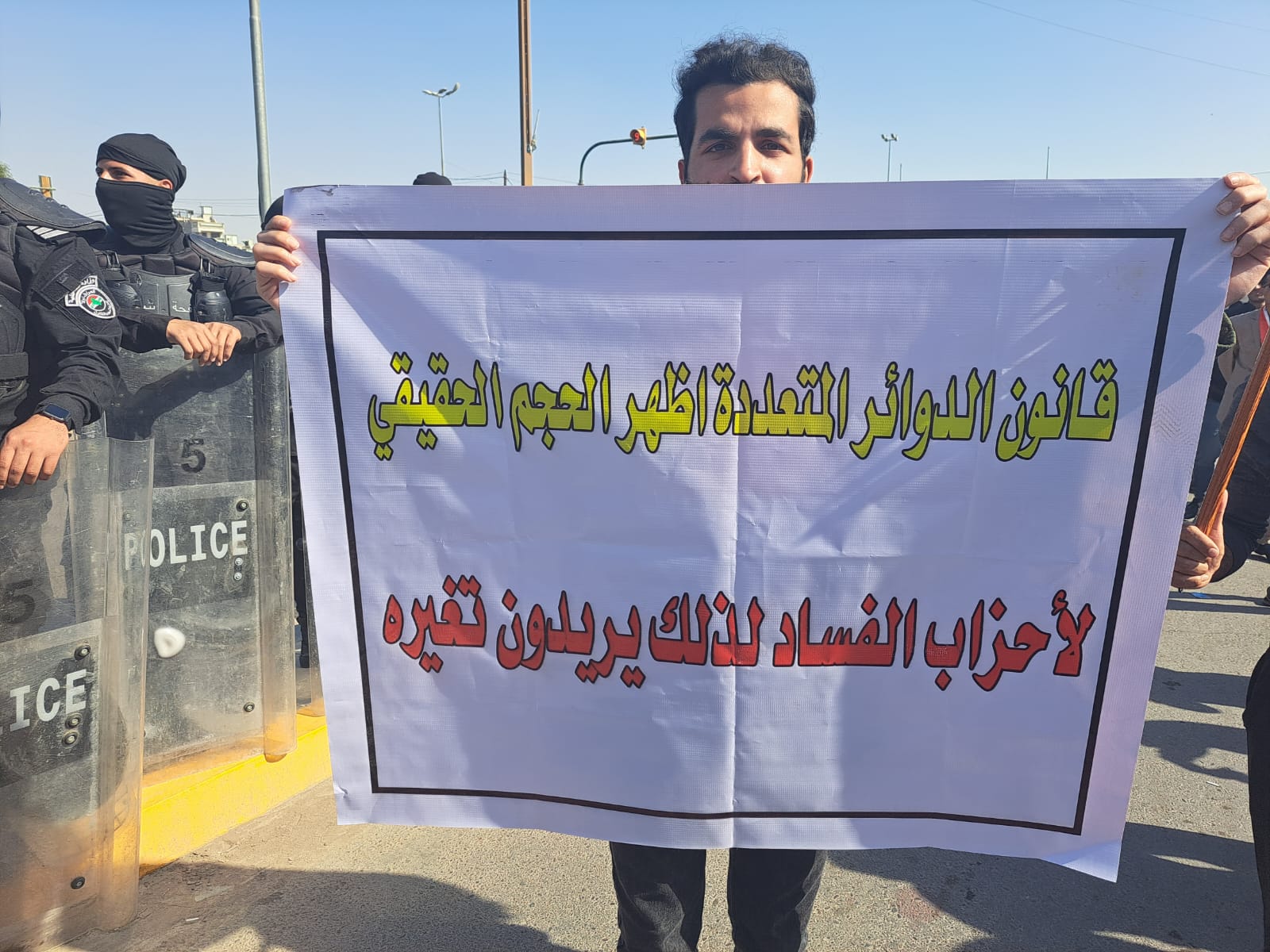 Protesters protest against calls for the passage of the Sainte-Laguë electoral law on the streets in Baghdad on February 27, 2023. Photos by Haley Bobseine.
